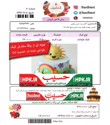 امکان ثبت سفارش انواع کیک در نرم افزار حسابداری قنادی حسیب نت. امکان ثبت بیعانه در رسید مشتری، امکان ثبت عکس تصویر مشتری در رسید، امکان گزارش تعداد سفارشات و پیگیری انواع سفارشات مشتری